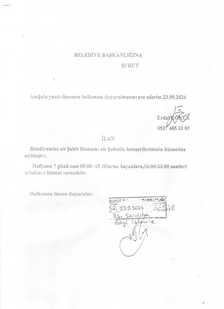 Belediyemize ait Şehir Hamamı siz Şuhutlu Hemşehrilerimizin hizmetinde.