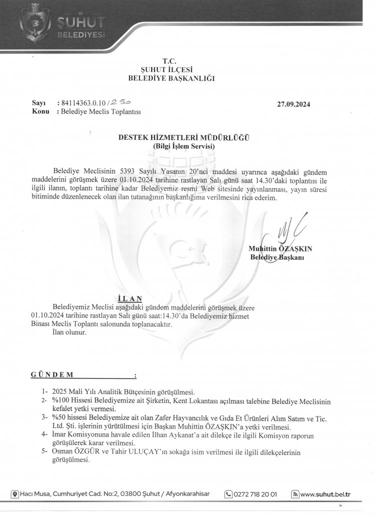 ŞUHUT BELEDİYE MECLİSİ ARALIK AYI TOPLANTI GÜNDEMİ 28.11.2025 TARİHİNDEN İTİBAREN YAYINLANMIŞTIR