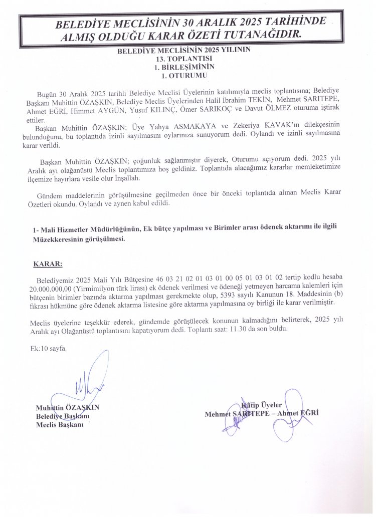 30.12.2025 TARİHLİ MECLİS OLAĞANÜSTÜ TOPLANTISI KARAR ÖZETLERİ