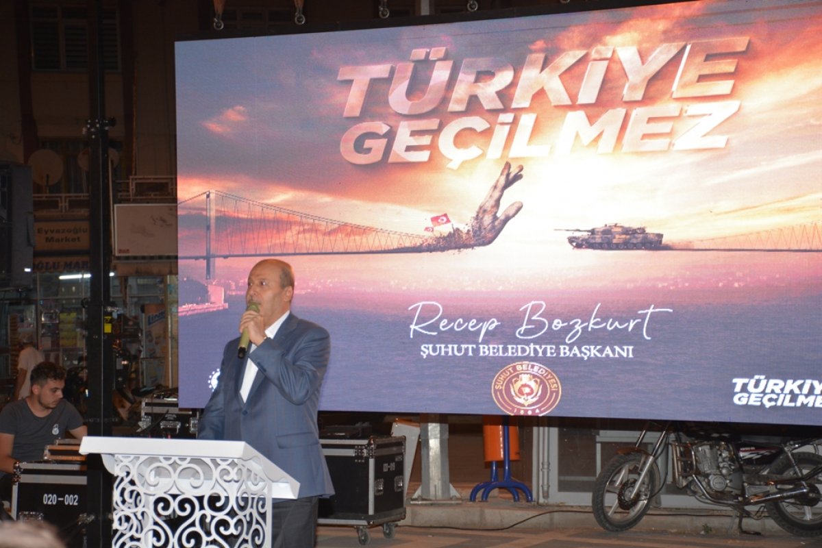 Şuhut Belediye meydanında düzenlenen programa vatandaşlar maske kontrolünün ardından meydana alındı.Oturma düzeninin de sosyal mesafe kuralına uygun hazırlandığı program Cumhurbaşkanı Recep Tayyip Erdoğan’ın canlı yayımlanan Millete Sesleniş konuşması ile başladı. Konuşmanın ardından saygı duruşu ve İstiklal marşı ile başlayan program sela ve Kur-an’ı Kerim tilaveti ile devam etti.Programda Konuşan Başkan Bozkurt'' SAYIN KAYMAKAMIM, KOMUTANIM, KURUM MÜDÜRLERİM VE AMİRLERİM, İLÇE BAŞKANLARIMIZ, KIYMETLİ İL GENEL MECLİSİ VE BELEDİYE MECLİSİ ÜYELERİMİZ, KIYMETLİ MİSAFİRLER, ÇOK DEĞERLİ ŞUHUTLU HEMŞEHRİLERİM. 15 Temmuz Demokrasi ve Milli Birlik Günü anma programına Hepiniz Hoş Geldiniz. Sizleri en kalbi duygularımla, hürmet, muhabbet ve saygıyla selamlıyorum. Bugün burada Şuhut Şehir meydanımızda FETÖ Terör Örgütü'nün 15 Temmuz 2016'daki darbe girişimine karşı Aziz Milletimizin kahramanca bir mücadeleyle elde ettiği zaferin beşinci yılını idrak ediyoruz. 15 Temmuz Gecesi Milletimiz ağır bir ihanete, vatanımız hain bir işgal girişimine maruz kaldı. Fakat Cenâb-ı Hak’kın yardımı ile aziz milletimiz, vatanına, bayrağına, ezanına ve iradesine sahip çıktı. Dine hizmet ediyor gibi görünerek yıllarca menfaat devşirenlerin emellerini boşa çıkardı. Zalimlerin tuzaklarını başlarına geçirdi. Kıymetli Hemşehrilerim! Yüce Kitabımız Kur’an-ı Kerimde şöyle buyrulur: “Onlara ‘Yeryüzünde fesat çıkarmayın’ denildiğinde, ‘Biz ancak ıslah edicileriz’ derler. Şunu bilin ki onlar bozguncuların ta kendileridir, lakin anlamak istemezler.” İyi bilinmelidir ki 15 Temmuz’da milletimizin istiklal ve istikbaline kasteden FETÖ, bir fitne şebekesidir. Dinî bir cemaat değildir. Dinimizi, Kitabımızı, Peygamberimizi, sadakamızı, kurbanımızı, mukaddes olan nice değerlerimizi istismar etmiştir. Göz bebeğimiz olan gençlerimizi sinsi planlarla ana babasına ve milletine düşman hale getirmiştir. Samimi müminleri kandırarak kazandıklarını zannedenler, hakikatte yalnızca kendilerini kandırmıştır. O halde, bilinçli, sağduyulu ve dirayetli olalım. Milli ve manevi değerlerimizi istismar etmeye çalışanlara asla fırsat vermeyelim. Kur’an-ı Kerim’in rehberliği, Peygamberimizin örnekliği hayatımıza istikamet verecektir. Güvenilir kaynaklardan öğreneceğimiz sahih dinî bilgiyle yaşayalım. Vatanımızın selameti, devletimizin bekası ve milletimizin huzuru için birlik ve beraberliğimizi koruyalım. Ey! terör örgütleri, Ey! Teröre destek veren Ülkeler, Ey! Terör örgütlerinden İktidar umanlar.Sizlere Cumhuriyetin Kazanıldığı,Zafer Meşalesinin Yakıldığı Topraklardan Şuhut’tan Sesleniyorum! Devletimizi yıkamayacaksınız, Bayrağımızı indiremeyeceksiniz, Milletimizi boyun eğdiremeyeceksiniz, Ezanlarımızı susturamayacaksınız, Ülkemizi bölemeyeceksiniz. Bu vesile ile konuşmamı bitirirken geçmişten günümüze vatan uğruna canını feda eden aziz şehitlerimizi rahmetle, kahraman gazilerimizi minnet ve şükranla yâd ediyorum''dedi. Başkan Bozkurt'un konuşmasının ardından İlçe Kaymakamı Erkan Kaçmaz'da konuşma yaptı.Protokol konuşmalarının ardından Türkiye Geçilmez teması üzerinde hazırlanan videolar izlendi. Müftülük programı ile anma etkinlikleri gece geç saatlere kadar program devam etti.Program vatandaşların yoğun katılımı ile gerçekleşti.
