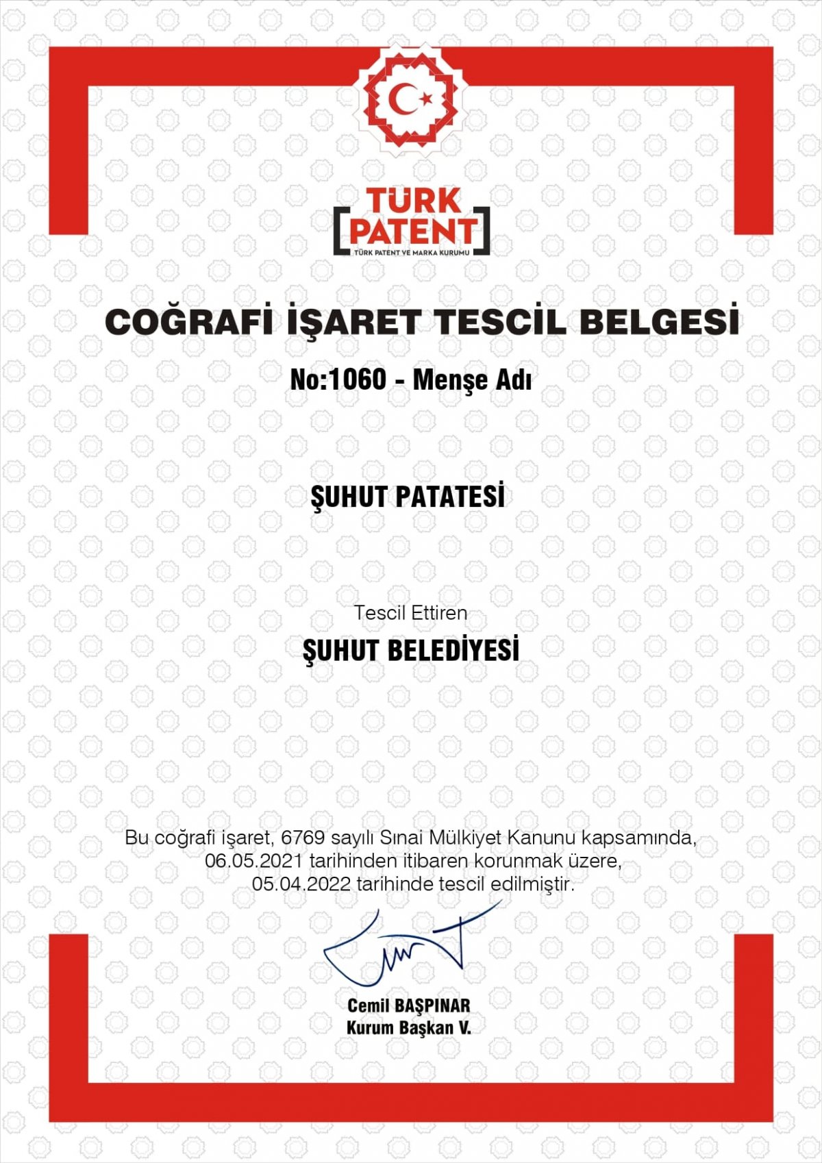 Şuhut Belediye Başkanı Recep Bozkurt tarafından Şuhut’ta üretilen ve ilçe ile özdeşleşmiş ürünlere coğrafi işaret tescili almak için yapılan çalışmalar sonuç vermeye devam ediyor. Şuhut Belediyesinin girişimleri ile Şuhut Keşkeği ve Şuhut Patatesi Türk Patent ve Marka Kurumu’ndan coğrafi işaret tescili aldı. Şuhut Belediye Başkanı Recep Bozkurt yaptığı açıklamada’’Şuhut Patatesinin Coğrafi İşaret Tescili Tüm Şuhut'umuza Hayırlı Olsun Dünyanın En Güzel Patatesi Şuhut Patatesi