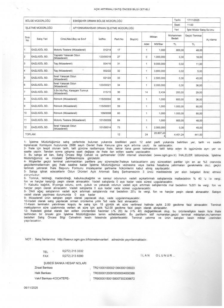 ORMAN GENEL MÜDÜRÜLÜĞÜ ESKİŞEHİR ORMAN BÖLGE MÜDÜRLÜĞÜ AFYONKARAHİSAR ORMAN BÖLGE İŞLETME MÜDÜRLÜĞÜ İHALE İLANI