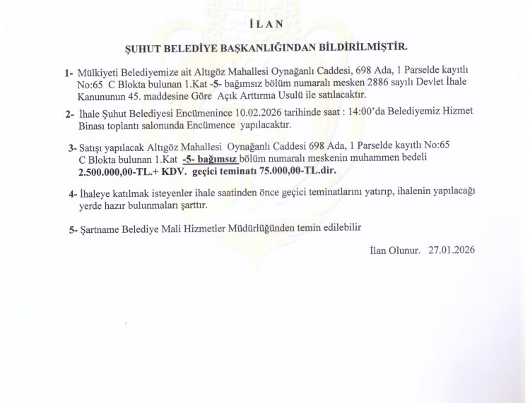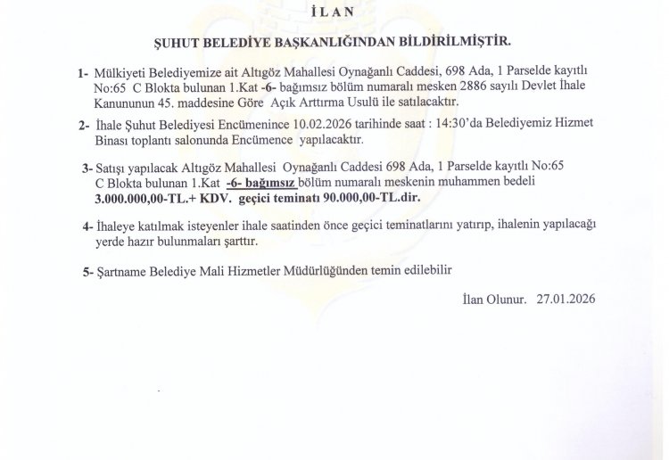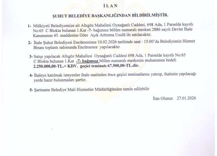 MÜLKİYETİ BELEDİYEMİZE AİT ALTIGÖZ MAHALLESİ OYNAĞANLI CADDESİNDE BULUNAN 3 ADET MESKEN VE 3 ADET DEPOLU İŞ YERİNİN İHALE BİLGİLERİ EKTE SUNULMUŞTUR.